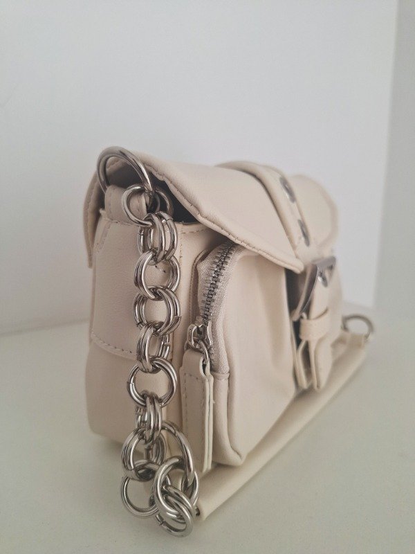 Confeccionada en ecocuero, bolsillos externos con cierre, interior forrado con bolsillo interno.